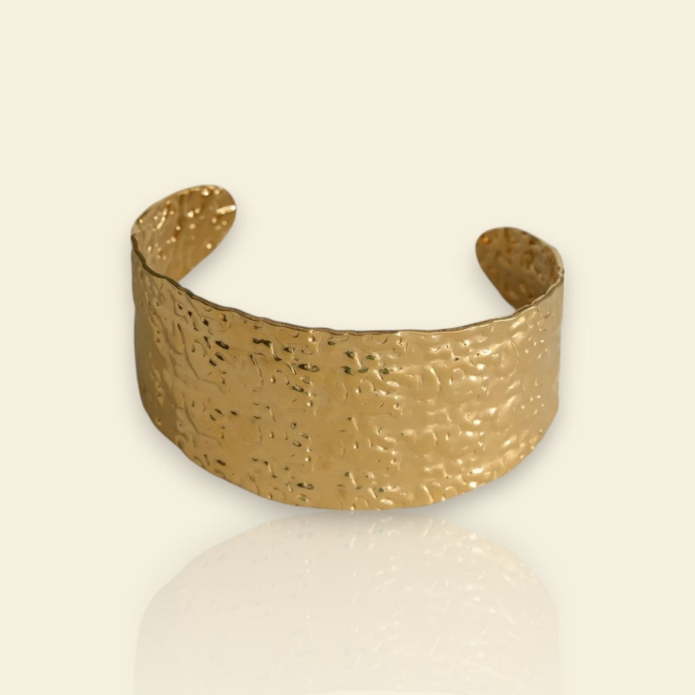 - Description : bracelet doré ouvert, de type manchette, à la finition martelée éclatante, offrant une allure majestueuse. Élégamment ajustable, il illumine instantanément votre poignet avec une touche de sophistication unique.