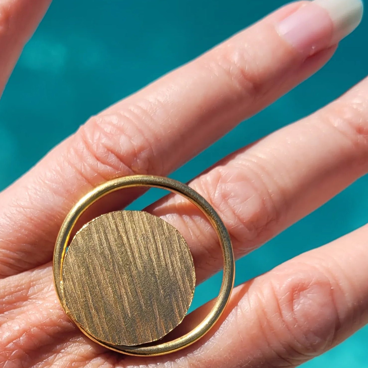 Élégante et audacieuse, la bague ethnique Danku associe une pastille et un cercle en bronze brossé. Bague femme réglable, elle séduit par son éclat doré et son design sculptural. À assortir au bracelet Danku pour un duo raffiné.
