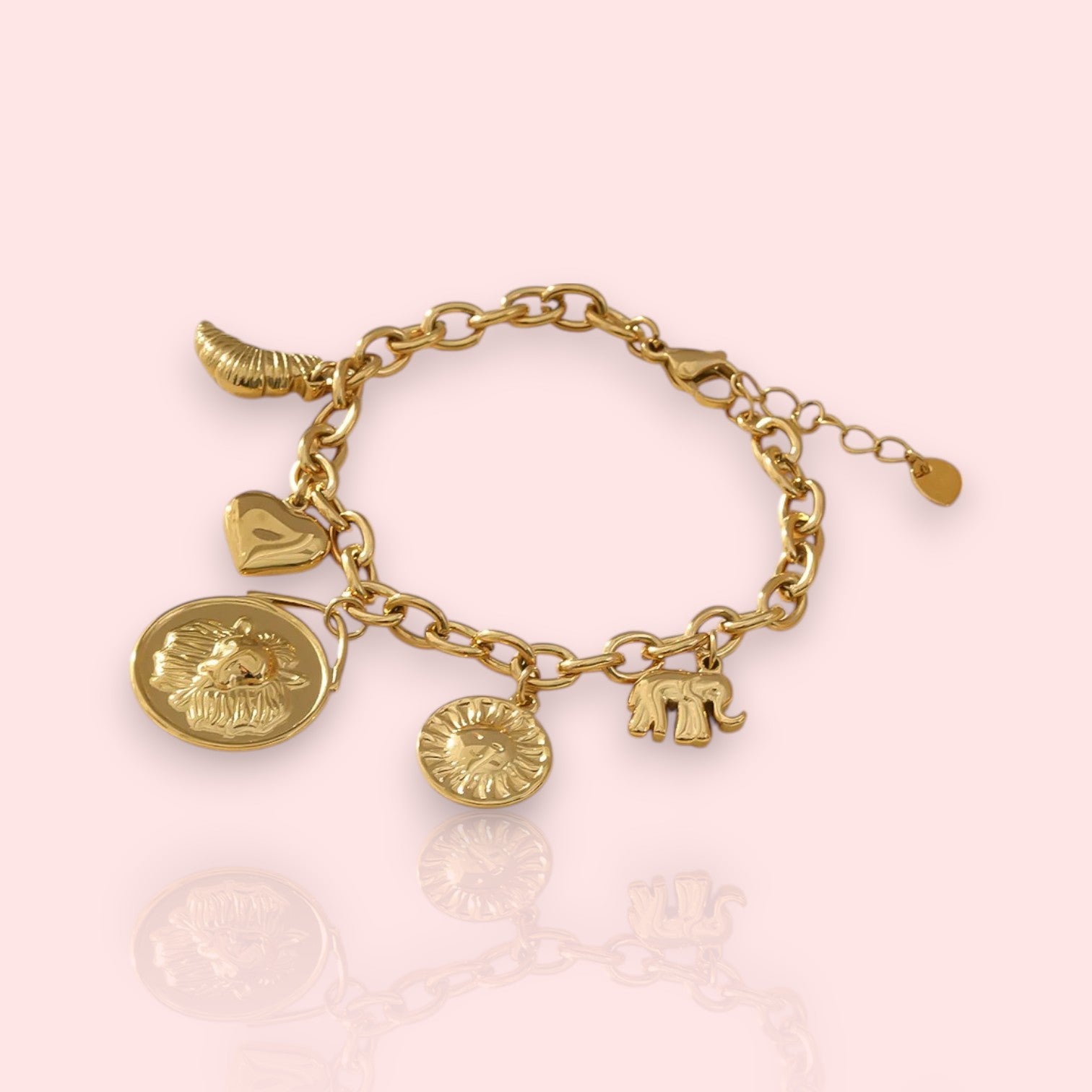 - Description : bracelet chaîne orné de multiples breloques inspirées des éléments terrestres : animaux, cœur, soleil, et une touche ludique avec un croissant gourmand. Des pendentifs charmants et évocateurs qui ajoutent une dimension fantaisiste et unique à votre poignet !